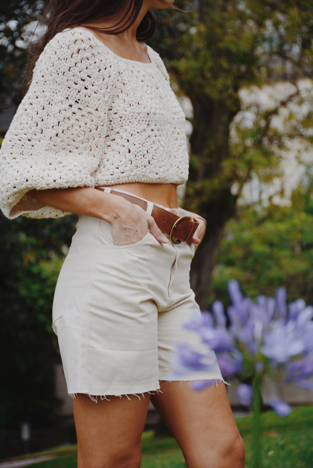 De tiro alto, con bolsillos delanteros y traseros, y sin ruedo — para que elijas cómo llevarla: desflecada o doblada, según tu estilo.
